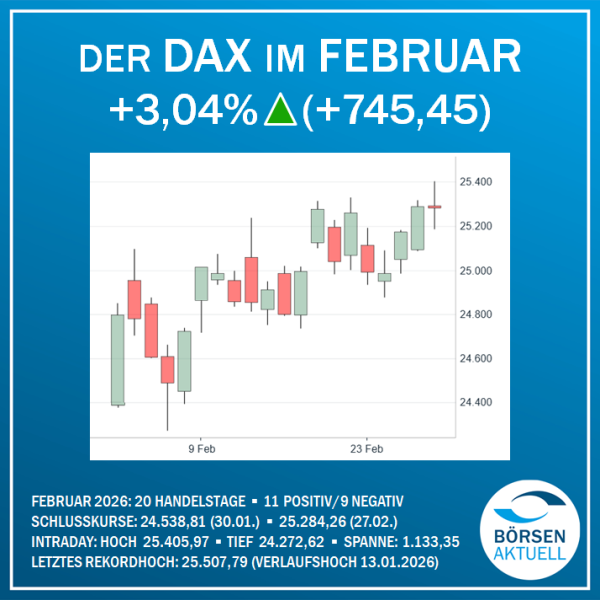 Im Februar schloss der DAX bei 25.284,26 Punkten und damit +3,04 Prozent (+745,45 Punkte) höher als im Vormonat. Von den 20 Handelstagen dominierten 11 positive […]