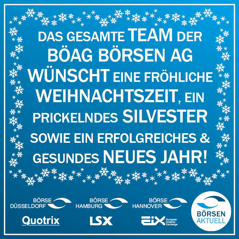 Das gesamte Team der BÖAG Börsen AG wünscht eine fröhliche Weihnachtszeit, ein prickelndes Silvester sowie ein erfolgreiches und gesundes neues Jahr! 🎅🎄🥂🎇