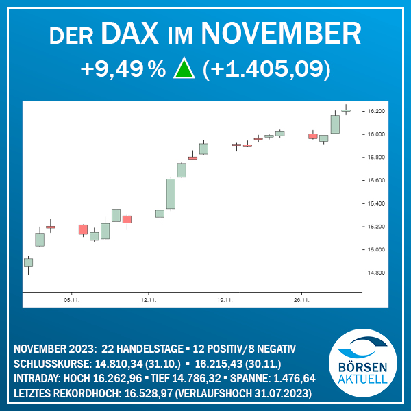 Den November 2023 beendete der DAX mit 16.215,43 Punkten und damit 9,5 Prozent (+1.405,09 Punkte) höher als den Vormonat Oktober. Von den 22 Handelstagen schlossen 12 positiv und 8 negativ. Der Intraday-Tiefstand wurde bei 14.786,32 Punkten markiert; der Tageshöchststand lag bei 16.262,96 Punkten, was eine Handelsspanne von 1.476,64 Punkten bedeutet.