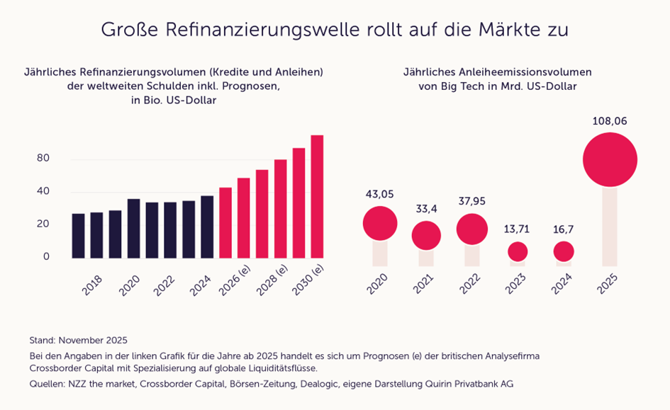 In den nächsten Jahren rollt eine riesige Refinanzierungswelle auf die Märkte zu – sowohl bei Staats- als auch bei Unternehmensanleihen. Insbesondere aufgrund des KI-Expansionsdrangs der Tech-Riesen sowie des damit verbundenen Refinanzierungsbedarfs ist mit billionenschweren Bondemissionen dieser Unternehmen zu rechnen – in den kommenden fünf Jahren laut Schätzungen allein zur Finanzierung von Rechenzentren rund 1,5 Bio. US-Dollar.
