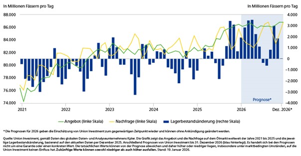 Im Ölmarkt übersteigt das Angebot die Nachfrage angesichts der OPEC-Produktionserhöhungen und einer verhaltenen Konjunktur erheblich, was zu einem massiven Aufbau an Lagerbeständen geführt hat. Derzeit dürften die politischen Entwicklungen in Venezuela, Russland/ Ukraine sowie Iran die Marktteilnehmer auf Trab halten. Union Investment erwartet ein Preistief bei Öl im ersten Quartal 2026, bevor eine Erholung im zweiten Halbjahr einsetzen könnte.